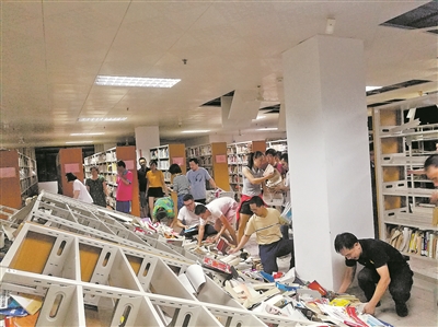 9月16日,肇庆学院师生志愿者连夜转移被台风损坏的图书馆图书。肇庆学院供图