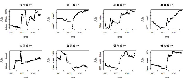 自20世纪90年代初至今,绝大部分性质的院校教职工数量有所增长(师范院校除外)。此外,各性质院校的专任教师数量变化趋势差异较大。其中,2003年,理工院校和师范院校教职工数量的减少受该性质类别的院校数量减少导致(2001年理工院校19所,师范院校3所;2003年理工院校17所,师范院校2所);1995年,农业院校教职工数量迅速增加受原北京农业大学和原北京农业工程大学合并组建中国农业大学的影响。(作者:杨楠)