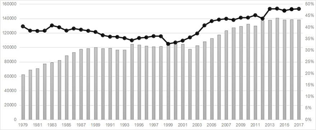 自改革开放以来,北京高校教职工数量由6万多人增至将近14万人,也呈现三段式发展。与专任教师数量变化不同的是,在经历了第二阶段(20世纪90年代末-21世纪初)的小范围波动之后,第三阶段(21世纪初至今)增长速度较慢且低于其第一阶段(改革开放初至20世纪90年代末)。此外,专任教师数量在教职工数量的占比变化并不大,从1979年的40%到2015年的48%,中间经历了几次小幅上升和下降,占比最低时为33%。