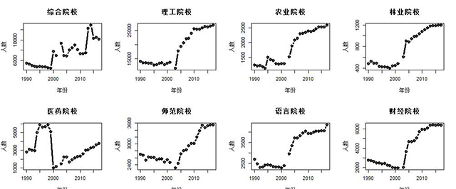 自20世纪90年代初至今,绝大部分院校的专任教师数量翻了一番(医药院校除外)。此外,大部分性质的院校专任教师数量从2004年前后进入快速增长时期。在20世纪90年代至21世纪初,受外部环境的影响,各性质院校的专任教师数量变化各异。其中,医药院校的专任教师数量在1994年和1995年中迅速增加与2000年的急剧下降,分别受 “北京医学院”升格为“北京医科大学”之后扩大规模以及北京大学与北京医科大学合并的影响。