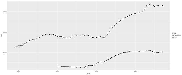 专任教师数量:北京高校(虚线)与市属高校(实线)