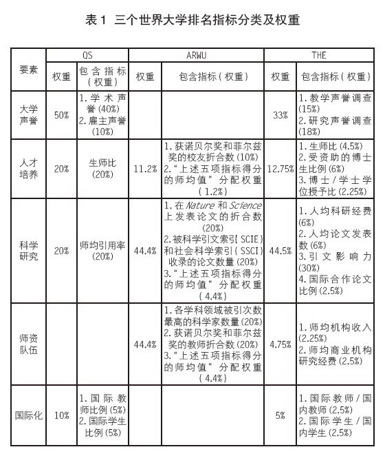 当前,影响力较大的世界大学排名主要有三个:世界大学排名(QS)、《泰晤士高等教育》世界大学排名(THE)和上海交通大学世界大学学术排名(ARWU)。这些世界大学排名均通过可量化的、具有国际可比性的客观指标对全世界范围内重点大学的学术能力和学术表现进行评价和比较。由于世界大学排名在排名目的、指标设计与权重分配、数据采集与处理等方面的差异,导致不同世界大学排名体系下各大学的排名并不是一致的。因此,排名结果不作为我们的研究对象,而是将具体指标作为获得大学国际竞争力构成要素的重要来源和基础,通过提炼和归纳,找到这些指标的特征、共性。大学国际竞争力本身是不可量化的,从技术操作层面看,从世界大学排名的视角分析大学国际竞争力的构成要素具有较高的可行性和有效性。