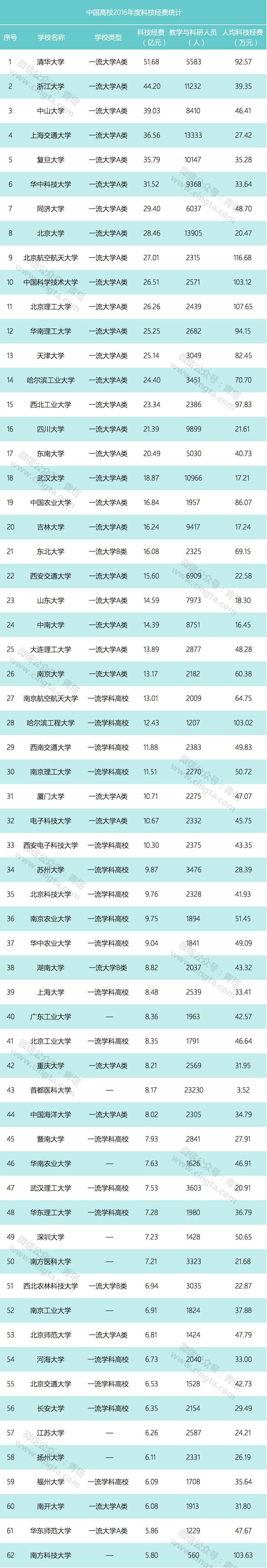 从2016年中国高校科技经费的统计结果来看,共有256所高校年度科技经费超过1亿元。清华大学的年度科技经费高达51.68亿元,排名全国第一。浙江大学以44.20亿元位居全国第二。中山大学以39.03亿元位居全国第三,相比去年大幅增加19.73亿元,排名也从去年的第14位上升到第3位。上海交通大学以36.56亿位居第四。复旦大学、华中科技大学、同济大学、北京大学、北京航空航天大学、中国科学技术大学都进入了全国前十。北京理工大学、华南理工大学、天津大学、哈尔滨工业大学、西北工业大学、四川大学、东南大学年度科技经费都超过了20亿。从全国范围看年度科技经费超过20亿的也仅有以上17所高校。