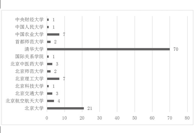 北京地区共有13所高校的在线开放课程被认定为国家级精品课程。其中,部属高校12所,市属高校1所。从课程认定结果的数量上看,清华大学共有70门国家级精品在线开放课程,占北京总体的56.9%。