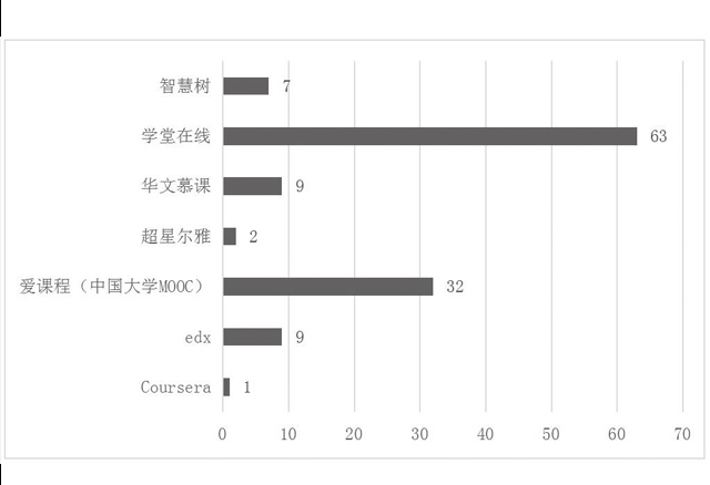 北京高校的精品在线开放课程涉及7家慕课(MOOCs)平台,其中,5家来自中国(学堂在线、爱课程、华文慕课、智慧树、超星尔雅),两家来自国外(EdX, Cousera)。其中,近八成的国家级精品在线开放课程来自学堂在线和爱课程两家慕课(MOOCs)平台。