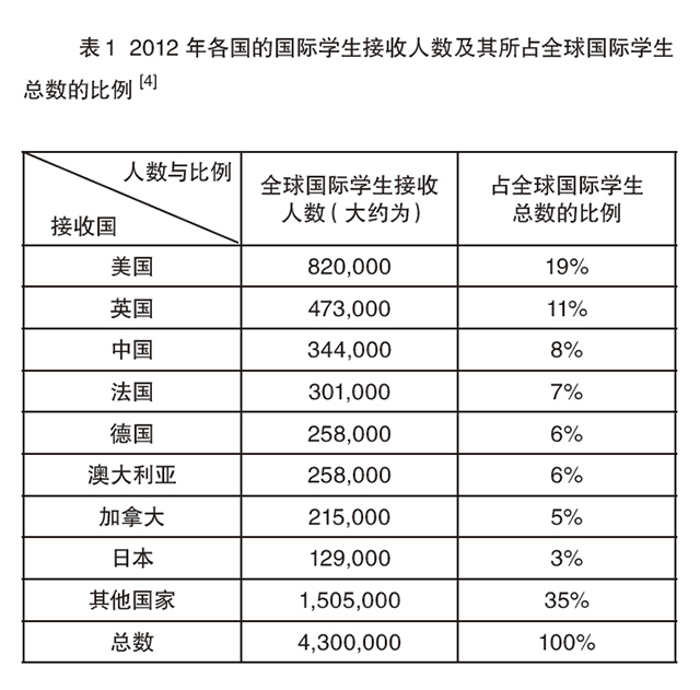 当今,高等教育国际化的发展现状对发展中国家高等教育国际化战略的实施存在一定的不利影响。主要表现在,世界学术中心继续强化集中在英语国家和欧盟等国,在西方国家的主导下,大学教育开始形成一套新的国际性标准,发展中国家在标准制定方面缺少话语权,目前来看只有跟从并获得发达国家机构的国际性标准认证,从而被动实现国际化。表1也能在一定程度上反映出当前高等教育国际化的发展现状。各国的国际学生接收人数及其所占全球国际学生总数的比例中,发达国家占据绝对优势。以2012年为例,国际留学生人数为430万人,主要发达国家美国、英国、法国、德国、澳大利亚、加拿大和日本接收的留学生人数为245.4万人,占比57%。[5]