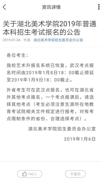 1月6日,湖北美术学院发布的报名时间顺延通告。