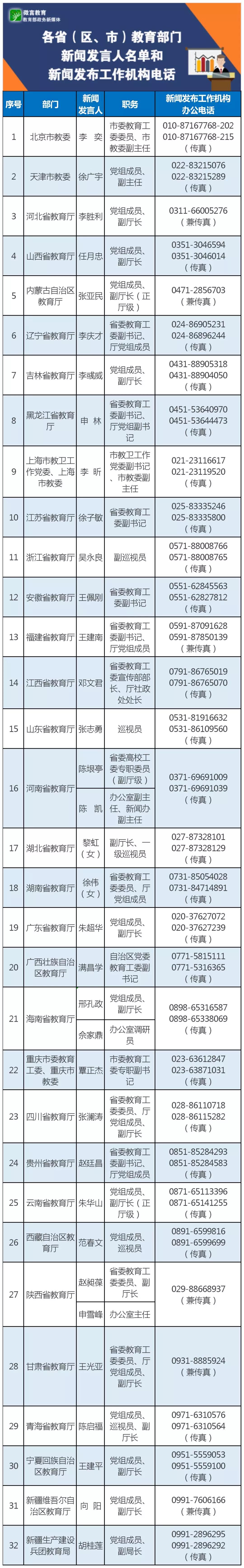 1月7日,教育部公布各省(区、市)教育部门、教育部直属高校及部省合建高校新闻发言人名单和新闻发布工作机构电话。具体名单一起看。