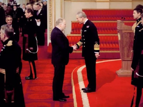 戴伟获得大英帝国勋章,与查尔斯王储在颁奖台上握手交流。