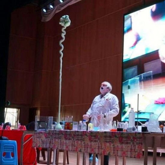 视频中,他摇晃手中的烧瓶,里边的液体因震荡与瓶中空气接触,颜色不断变化;他在洗洁精中加入双氧水和催化剂,瞬间产生的气泡,从试管中奔涌而出,直顶天花板;他还表演吸入密度比空气低的氦气,让声带震动速度加快,声音变得像唐老鸭。