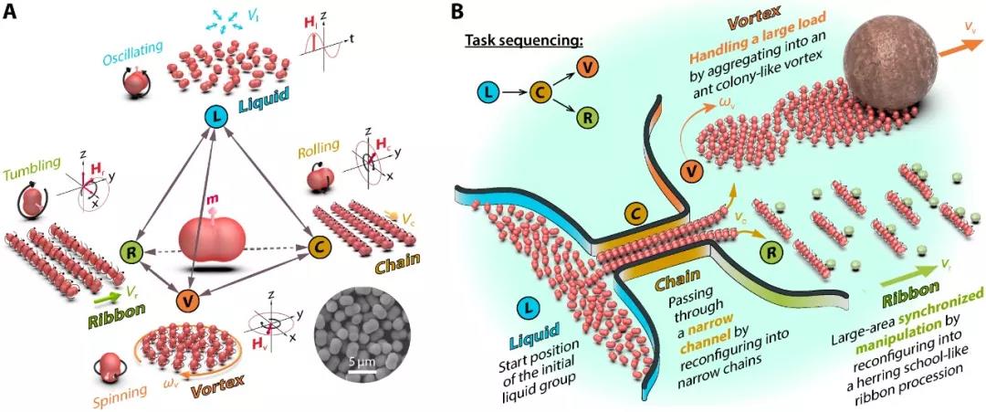 自然界中存在着丰富多样的生物自组织系统,表现出高度的群体智慧,可以解决个体无法胜任的复杂问题。比如分工协作的蚁群可构建复杂而精巧的蚁巢、搬运超重猎物,布阵捕食的鲱鱼群可轻松捕获非常警觉的桡足类动物,等等。受此启发,谢晖教授团队开发了一种磁性微游动机器人,这种呈花生状的磁性游动机器人长3微米,直径2微米,只有头发丝直径的约四十分之一。该机器人可成千上万地组队协同作业,机器人之间通过非常小的作用力交流,自组织成一个多模态的群体,就像蚁群用触觉或气味交流一样。群体可在旋转磁场的调控下,展现出多种随环境或任务快速响应的模态,其可变形为长链模态,高效穿越狭长的模拟毛细血管,还能够模拟自然界的蚁群(涡旋模态)和鲱鱼捕食阵列(横带模态),分别完成大负载可控输送与大面积同步集群清理操作。