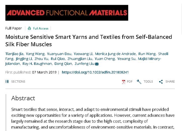 据悉,该研究受国家自然科学基金、天津市自然科学基金、南开大学相关计划资助。南开大学药物化学生物学国家重点实验室为论文《Moisture Sensitive Smart Yarns and Textiles from Self-Balanced Silk Fiber Muscles》(《湿度敏感的自平衡蚕丝人工肌肉及智能织物》)第一单位,刘遵峰教授为通讯作者,南开大学药学院2016级硕士研究生贾天娇为第一作者。