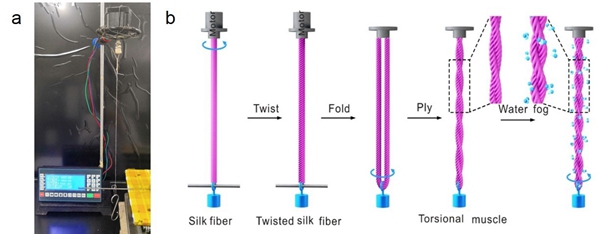 刘遵峰团队利用天然纯蚕丝制备了一种新型的“人工肌肉”纤维,不使用化学修饰和添加剂,通过脱胶、加捻、合股、热定型等常规工业流程制作获得。蚕丝“人工肌肉”在水雾和湿度驱动下实现了扭转、拉伸和收缩致动。为了不需要外界固定就能实现可逆驱动,刘遵峰团队开发了一种扭矩平衡的纤维结构,通过将扭曲的纤维对折、合股,使得蚕丝纤维实现了自平衡。