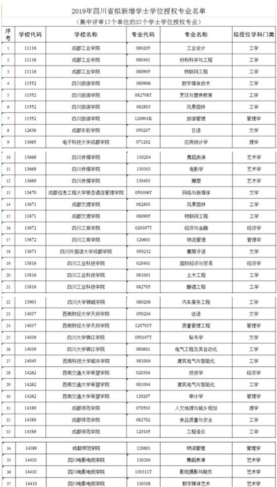 从省教育厅获悉,按照《四川省普通高等学校增列为学士学位授予单位和新增学士学位授权专业审核办法》(川学位〔2015〕3号),2019年省学位委员会组织专家集中评审了17所高校的37个拟新增学士学位授权专业。四川省人民政府学位委员会办公室对37个专业名单予以公示,公示时间为2019年5月21日-5月27日。