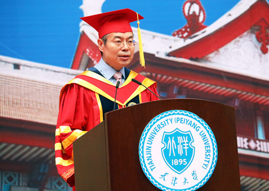 同学们,过了今天,你们会多一个身份,那就是天大的校友,你们将带着天大人的品格书写一个崭新的明天。在你们即将离开天大之际,我想说,天津大学永远是你们的坚强后盾,永远是你们的精神家园,永远是你们温馨的港湾,将会陪伴着你们一路前行。你们不懈的奋斗,一定会让梦想照亮现实。祝各位同学前程似锦!