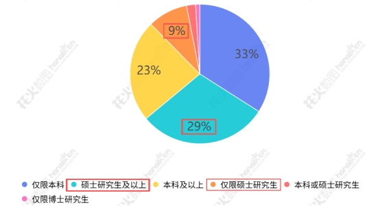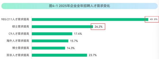 根据刚才提到的白皮书数据,企业对于985/211人才的需求提高比例是最高的,大概到了49.9%,其次是硕士的26.2%。