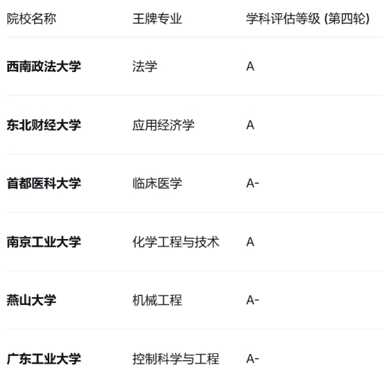 比如西南政法大学的法学、东北财经大学的应用经济学、南京工业大学的化学工程技术,都是A类学科。这些专业在全国名气都很响,资源一点不比名校差。
