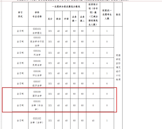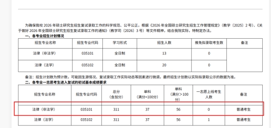 中南民族大学国际法学、法律(非法学)一志愿都是0人过线,其中法学理论、诉讼法学、法律(法学)一志愿也只有1人过线。