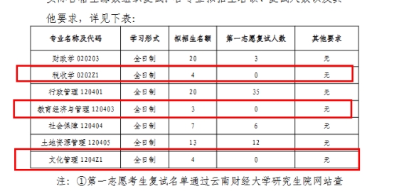 云南财经大学会计学院的企业管理(财务管理)、统计与数学学院的数量经济学、财政与公共管理学院的税收学、教育经济管理、文化管理等多个专业都出现了一志愿0人上线的情况。