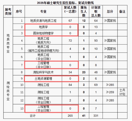中国矿业大学(北京)地球科学与测绘工程学院,地质学、固体地球物理学、土地资源管理,一志愿零人进入复试。