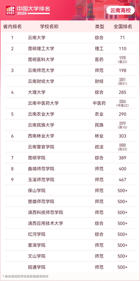 云南共计28所高校上榜,其中公办高校22所,民办高校6所。