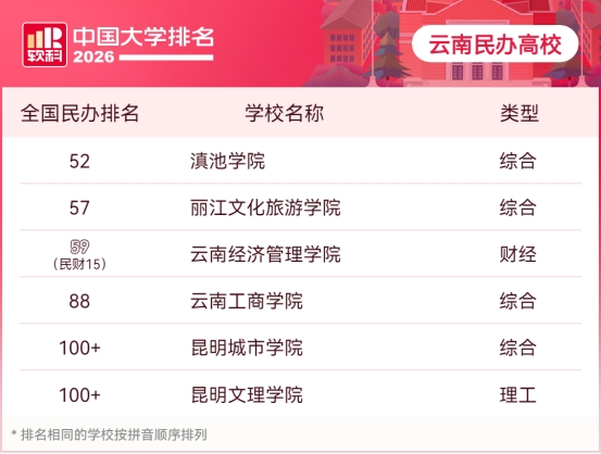 在民办主榜中,云南省共有3所高校登上榜单前100名。