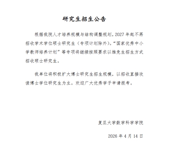 4月14日,复旦大学数学科学学院发布一则《研究生招生公告》,其中明确:根据学院人才培养规模与结构调整规划,2027年起不再招收学术学位硕士研究生(专项计划除外)。国家优秀中小学教师培养计划”等专项将继续按照要求以推免生招生方式招收硕士研究生。并将积极扩大博士研究生招生规模,以招收直接攻读博士学位研究生为主。