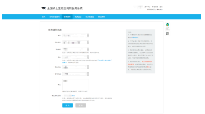 如需修改调剂志愿,可点击“修改”按钮进入修改调剂志愿页面进行修改,修改后点击“提交”按钮即可。