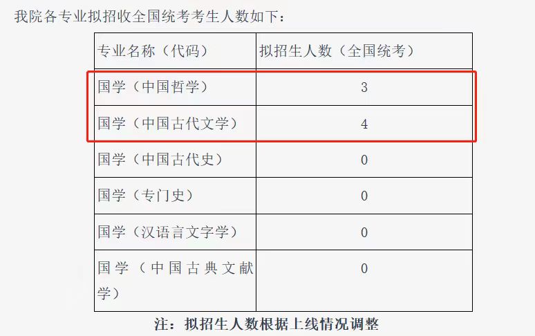 国学院中国哲学和中国古代文学2个专业,拟招生人数分别为3人和4人,但最后进复试的正好也是7人,且这7人均被录取。