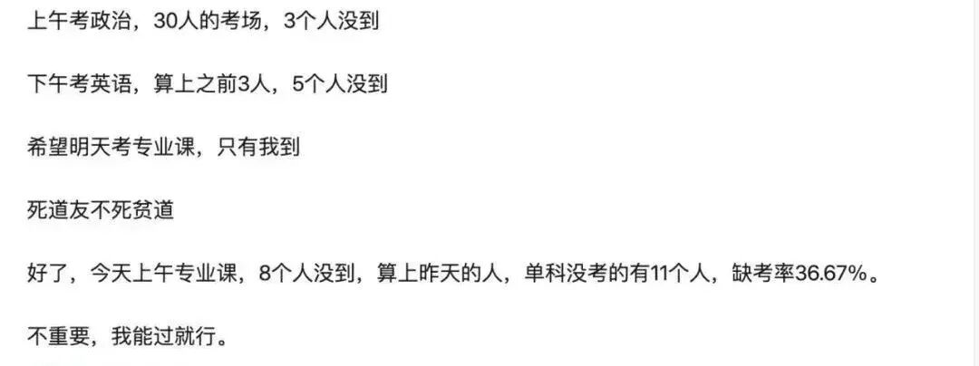 今天发这篇文章,是为了鼓励你要坚持住,毕竟每年缺考率都不低,你坚持到底,就已经打败30%左右的对手了,你只需要走完这几天,就成功一半了!请你相信,真的会有惊喜在等你~