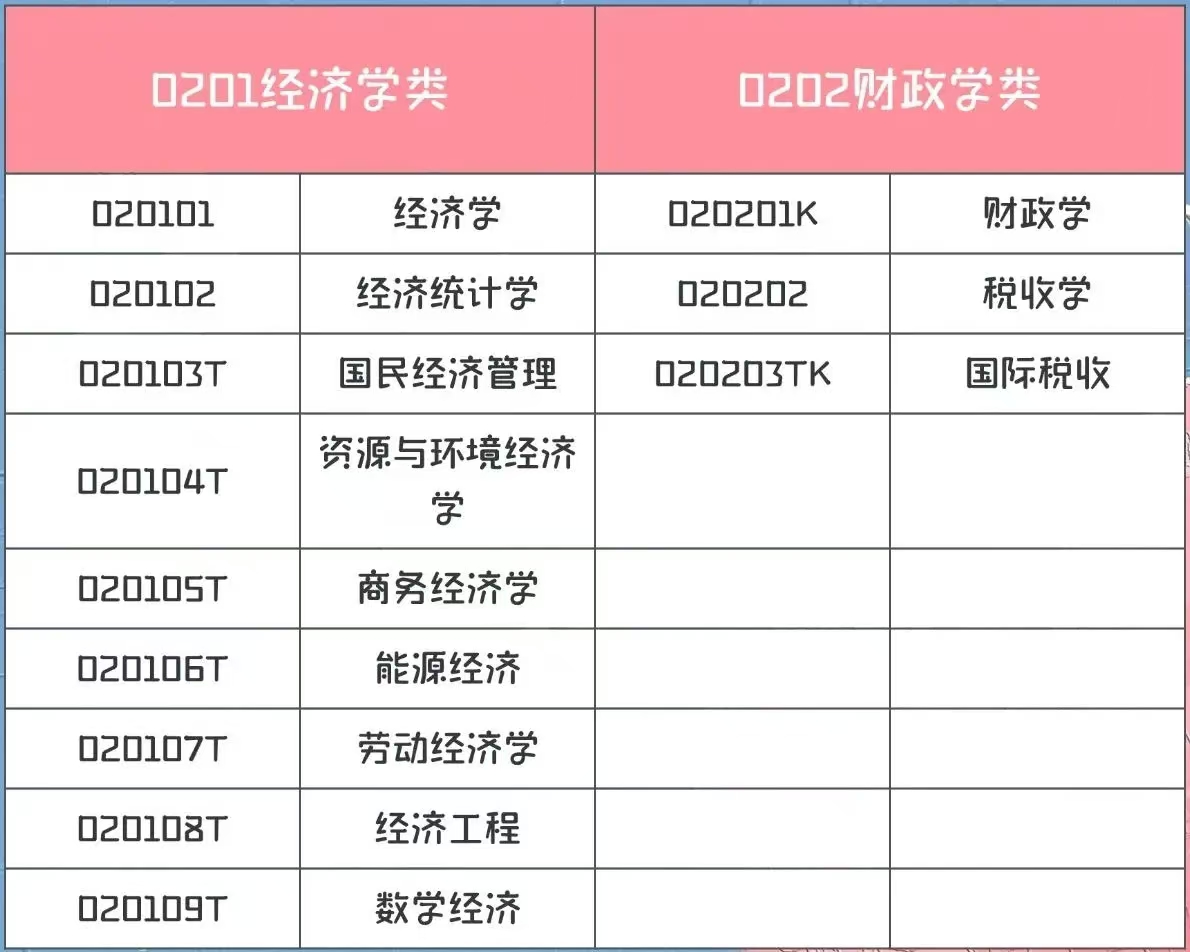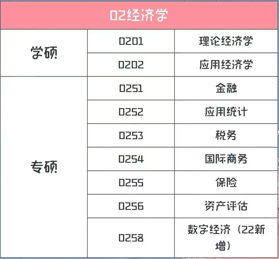 主要分为两类,一类是学硕,一类是专硕。学硕主要包含0201理论经济学,0202应用经济学,除了这两个专业以外,还有一个专业设置叫统计学,对于数学的要求相对来说比较高,和经济学息息相关但又相对独立,大部分学校会把它放到理学里面。