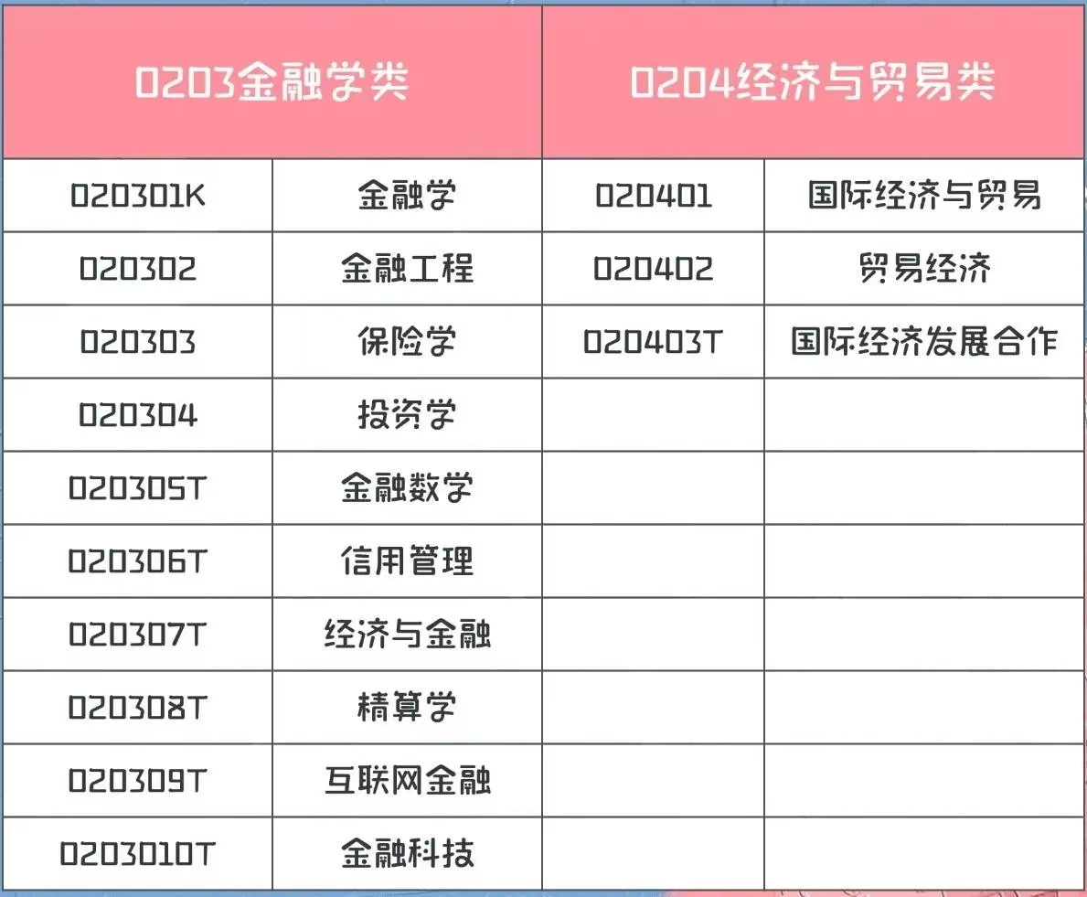 财政学大类主要以财政学和税收学这两个专业为主。第三个大类主要是金融学类,第四个是专业经济与贸易类,这两个专业大家了解比较多,像金融学、金融工程、保险学、投资学,本科期间相当大一部分同学是这个专业的。经济与贸易类主要是国际经济与贸易,以及贸易经济这两个专业。