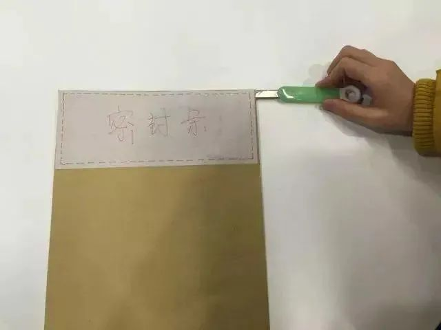 (1)从信封一侧将小刀插进去,紧贴最外一层开封,避开里面那个舌头。