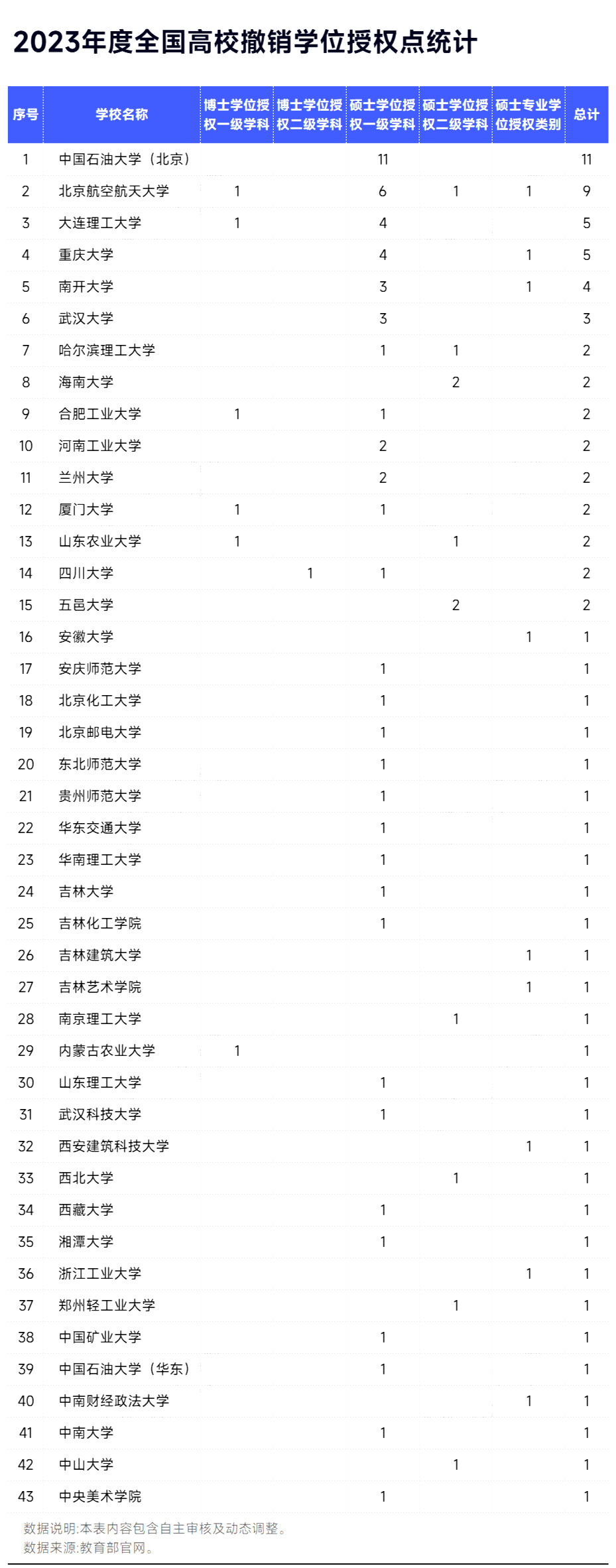 其中,中国石油大学(北京)撤销11个学位点,数量最多;北京航空航天大学撤销9个学位点;大连理工大学和重庆大学各撤销5个学位点;南开大学和武汉大学分别撤销4个和3个学位点;哈尔滨理工大学等9所大学各撤销2个学位点;其余高校各撤销1个学位点。