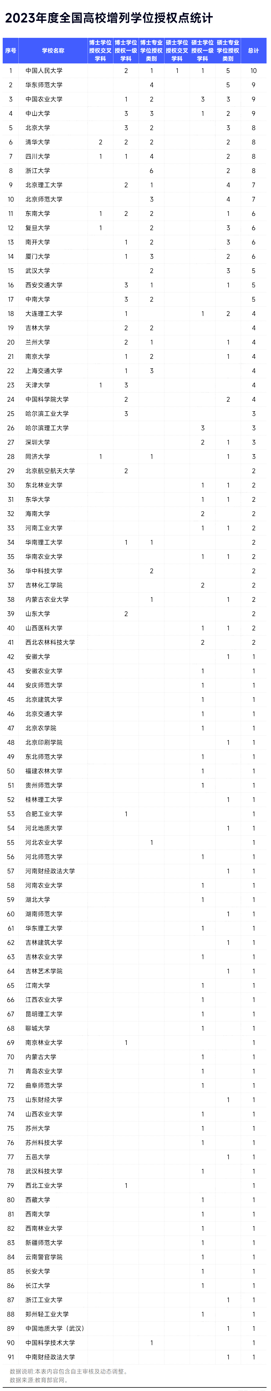 其中,中国人民大学增列10个学位点,为增列学位点最多的高校;华东师范大学、中国农业大学和中山大学各增列9个学位点;北京大学、清华大学、四川大学和浙江大学各增列8个学位点。