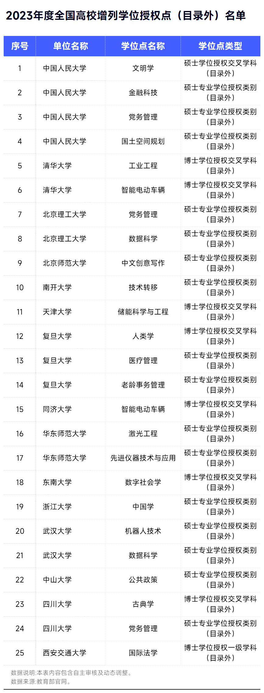 值得一提的是,根据《国务院学位委员会关于下达2023年度学位授权自主审核单位撤销和增列的学位授权点名单的通知》,在本次自主审核及动态调整增列学位授权点名单中,共有15所高校增列25个目录外学位点。