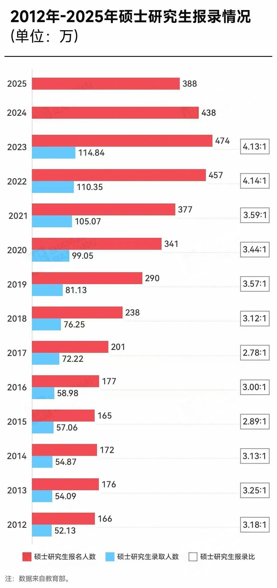 据统计,2025年全国硕士研究生报名人数为388万。考研报名总人数继去年迎来下降拐点后再次下滑,直线下跌50万,跌破400万大关。