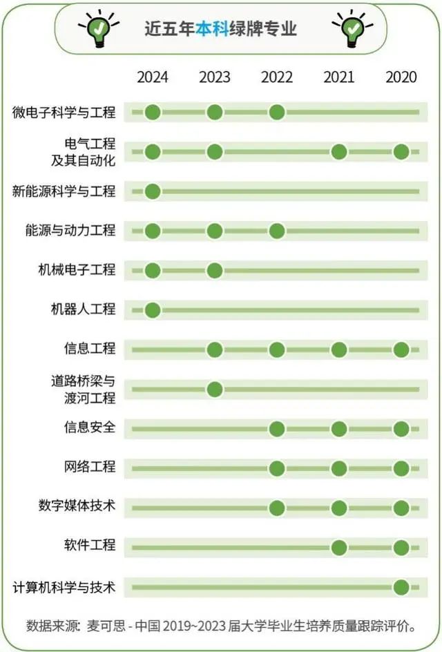 得益于信息化时代的发展,多个信息技术相关本科专业连续绿牌,高职绿牌专业多与铁路交通相关。其中,2024年本科就业绿牌专业包括微电子科学与工程、电气工程及其自动化、新能源与动力工程、能源与动力工程、机械电子工程、机器人工程。