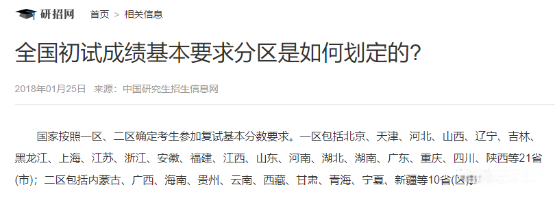 从中国研究生招生信息网发布的复试分数线也可以看出,教育部依据考生报考地的所处区域位置划分不同的复试分数线,这其中的划分区域就是我们常说的一区、二区。