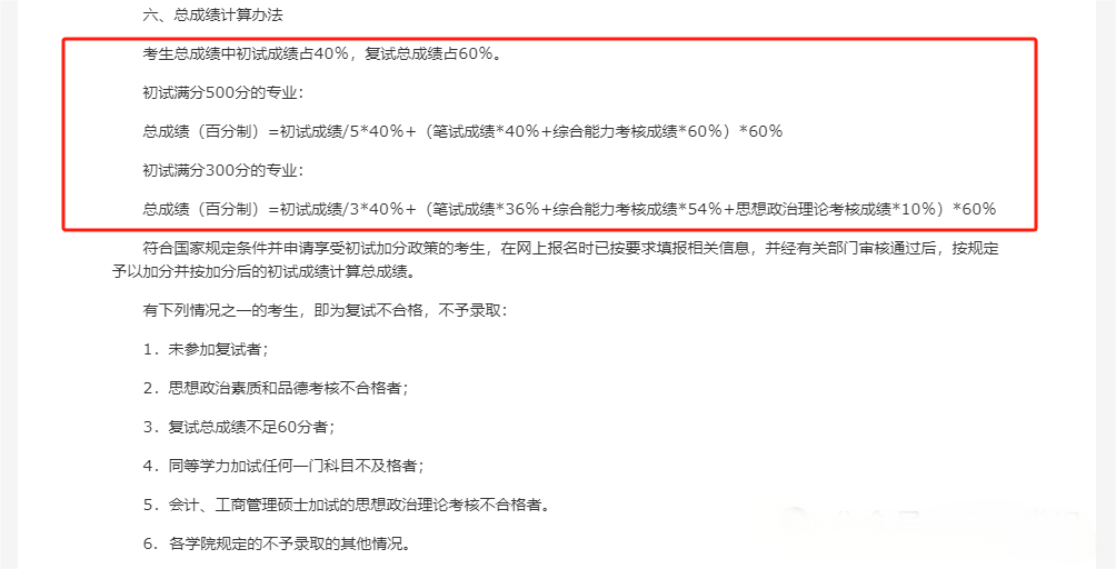 总成绩(百分制)=初试成绩/3*40%+(笔试成绩*36%+综合能力考核成绩*54%+思想政治理论考核成绩*10%)*60%