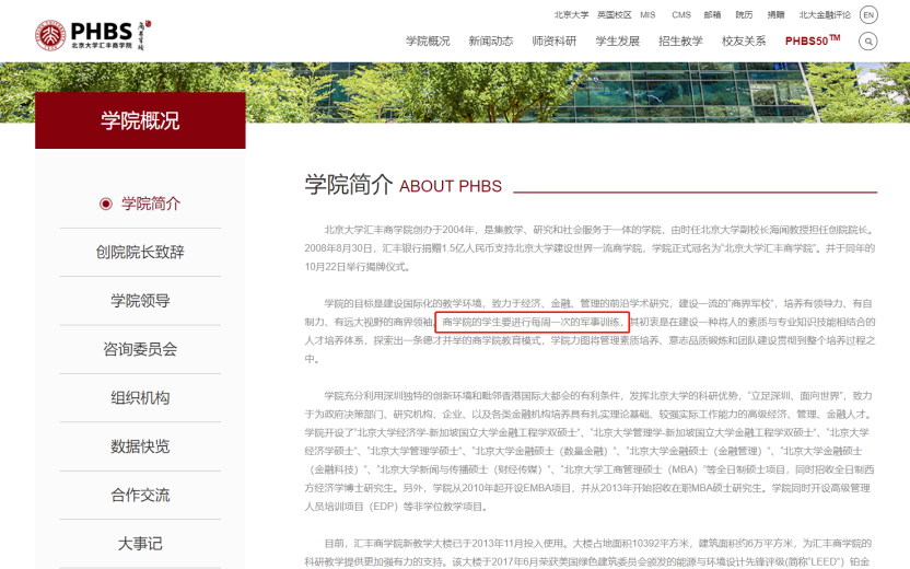 北大汇丰商学院作为“商界军校”,军训是该校一大特色,从学校官网的简介可以看出北京大学汇丰商学院每周都要进行一次军事训练,目的也很明确:锻炼大家的意志力,培养团队建设能力。