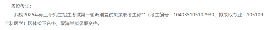 我校2025年硕士研究生招生考试第一轮调剂复试拟录取考生孙**因体检不合格,取消其拟录取资格。