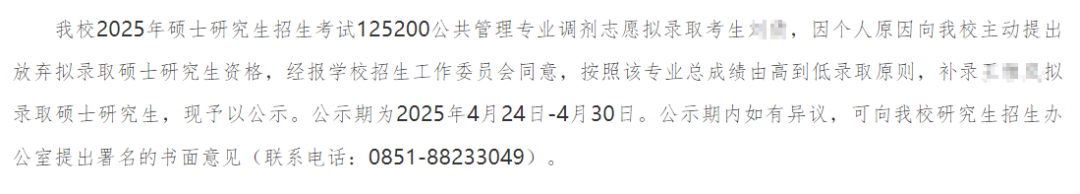 我校2025年硕士研究生招生考试125200公共管理专业调剂志愿拟录取考生,因个人原因向我校主动提出放弃拟录取硕士研究生资格。