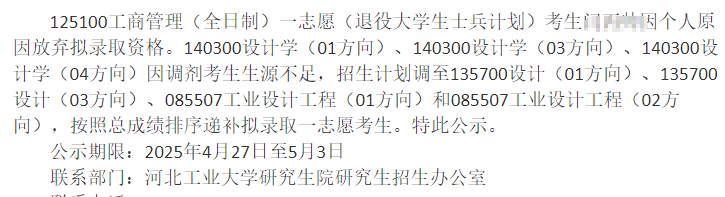125100工商管理(全日制)一志愿(退役大学生士兵计划)考生因个人原因放弃拟录取资格。