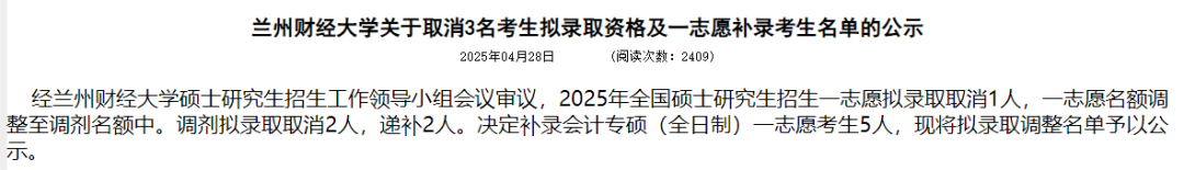2025年全国硕士研究生招生一志愿拟录取取消1人,一志愿名额调整至调剂名额中。调剂拟录取取消2人,递补2人。决定补录会计专硕(全日制)一志愿考生5人。