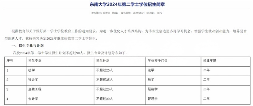 东南大学发布了2024年第二学士学位招生简章。法学、社会学、金融工程、会计学有招。