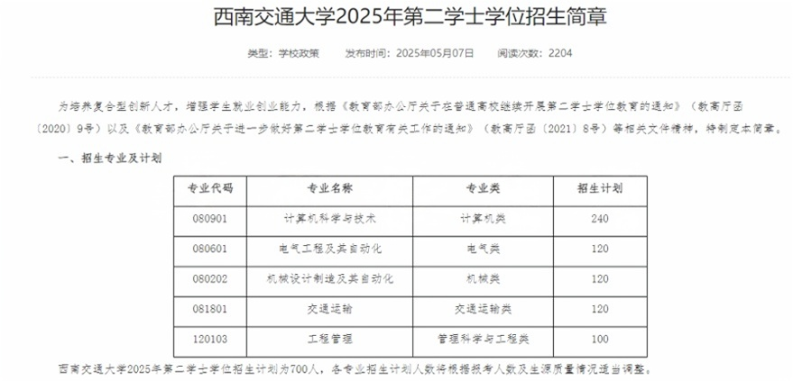 西南交通大学发布了2025年第二学士学位招生简章。080901计算机科学与技术、080601电气工程及其自动化、080202机械设计制造及其自动化、081801交通运输、120103工程管理专业有招。