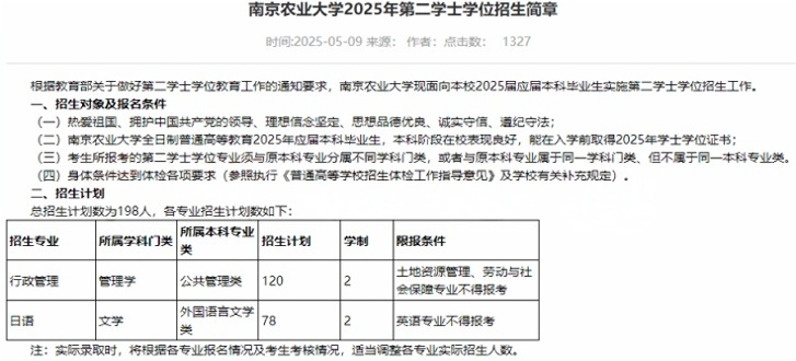 南京农业大学发布了2025年第二学士学位招生简章。行政管理、日语两个专业有招。