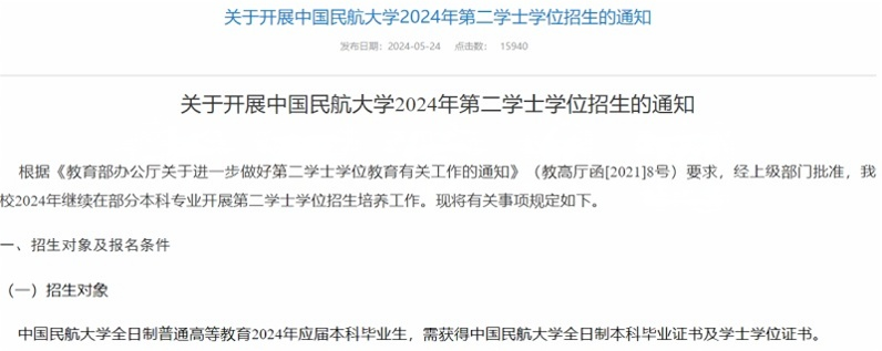 中国民航大学发布了2024年第二学士学位招生的通知。