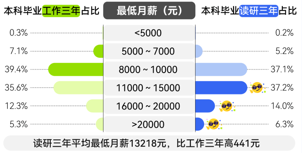 选择继续读研深造的同学,现在能拿到的平均最低月薪为13218元,比当初选择直接工作的同学高出441元。